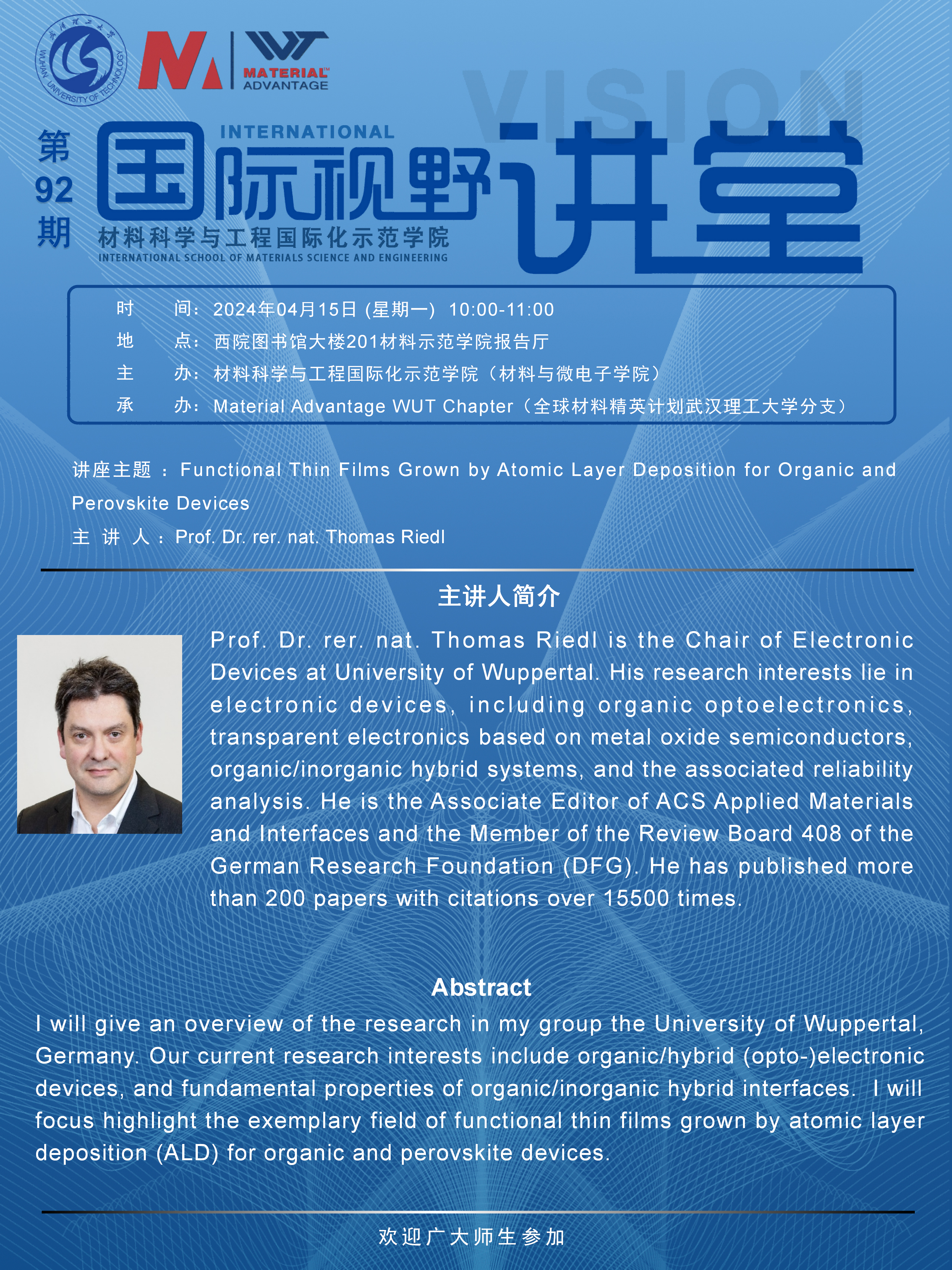 【国际视野讲堂】第92期:德国伍珀塔尔大学Thomas Riedl 教授学术报告会