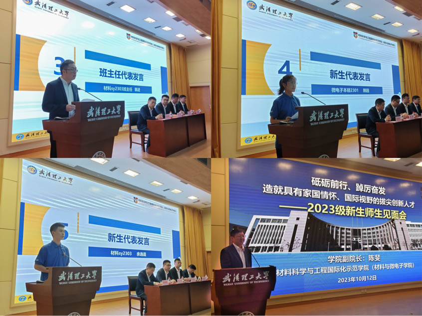 聘任仪式结束后,韩进老师作为班主任代表发言,他表示会尽职尽责做好班主任工作,全心全意为同学们服务,并勉励同学们提升综合素质和科学素养,做可爱可信可贵可为的新时代大学生。随后,微电子本硕2301班新生代表韩园同学上台发言,通过分析时事,表达了对科技强国的展望及刻苦学习开拓创新的决心。材科sy2301班新生代表余逸晨同学则向全体新生提出了以下几点倡议:独立自主,严格自律;练就本领,知行合一;心系社会,科研报国。